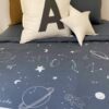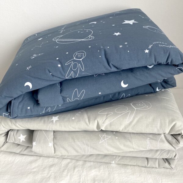 Acolchados realizados en tussor 100% algodón, con estampa galaxia sobre genero de diferentes colores. Relleno con guata.