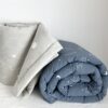 Disponible en azul, crudo, gris claro y gris medio, frente estampado y dorso del mismo color liso.