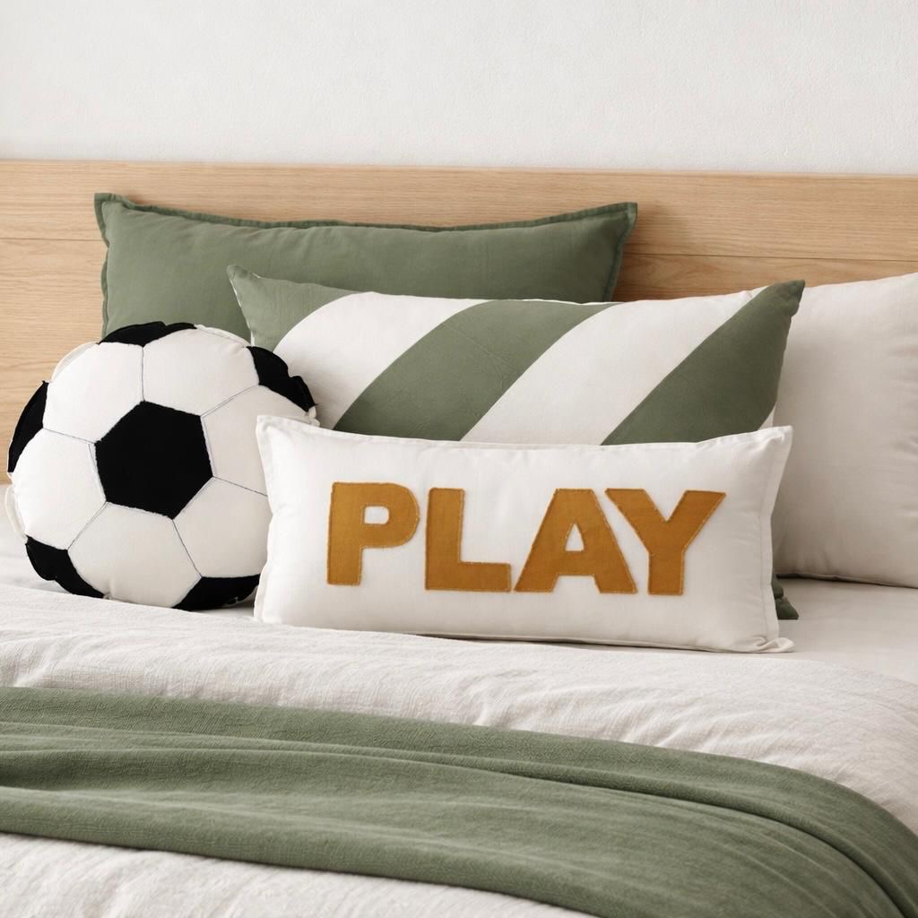 Almohadón íntegramente confeccionado en tussor 100% algodón, con diseño de pelota de futbol.