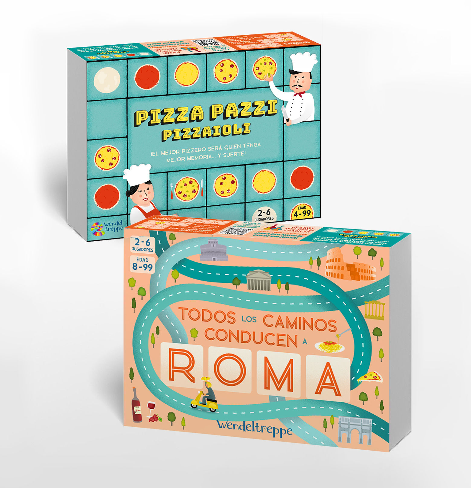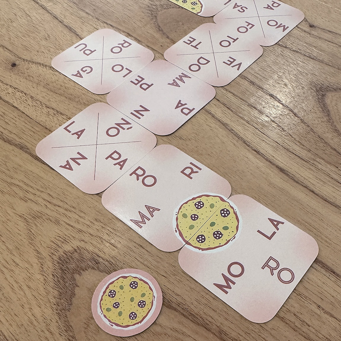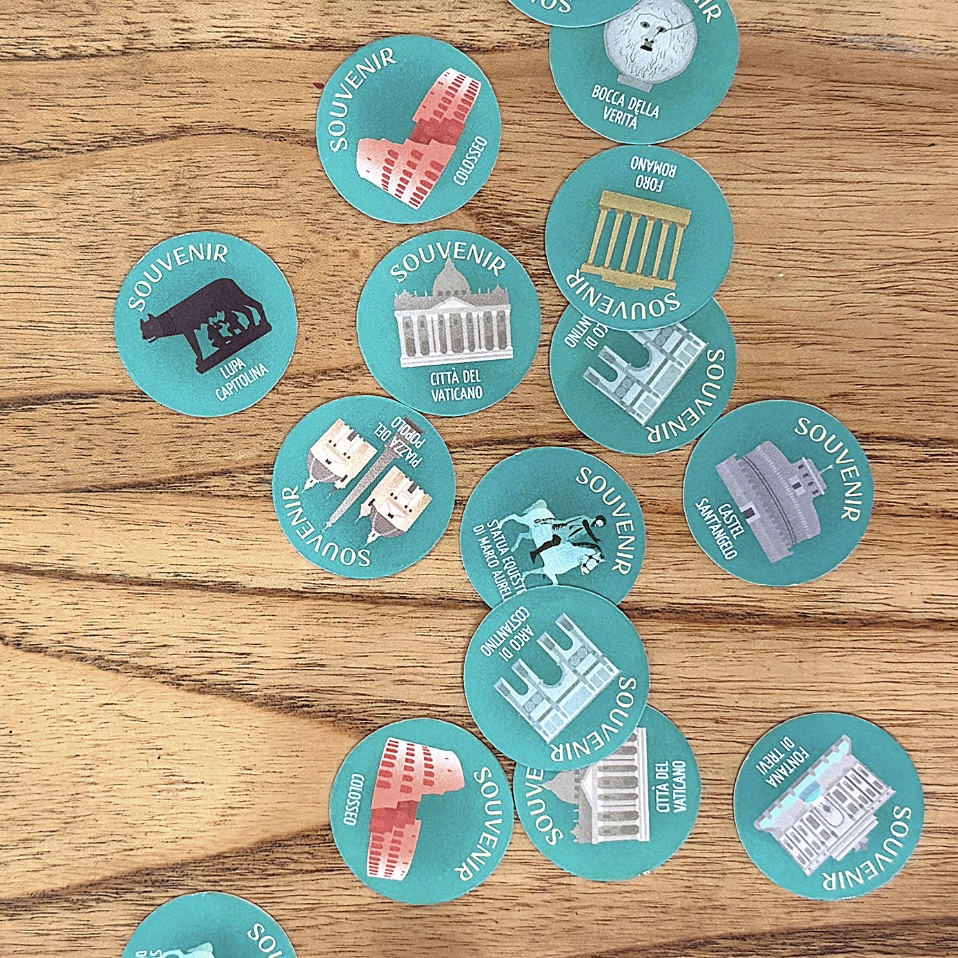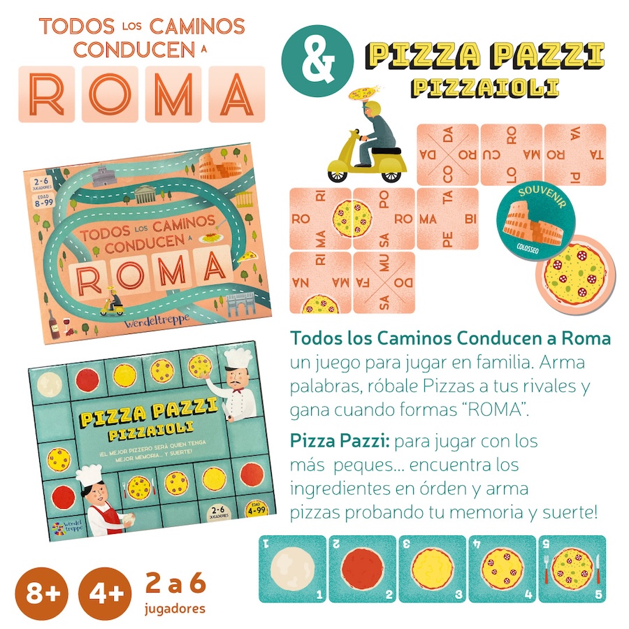 Hay que formar palabras conectando tarjetas, cada vez que formes Roma, ganarás un Souvenir pero si alguien forma una pizza, podrá robartelo, aunque no se lo harás tan fácil… se lo darás en forma de Pizza (dado vuelta) entonces quien te ha robado tendrá que esforzarce más, porque para reconvertirlo en Souvenir deberá conectar una tarjeta formando dos palabras!