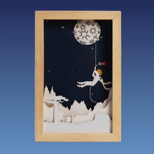 Cuadro con luz realizado con capas de papel calado que dan sensación 3D.