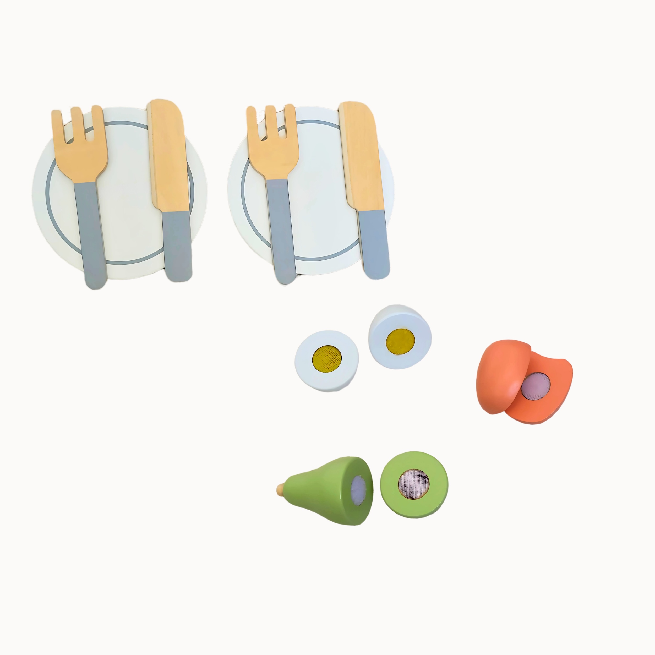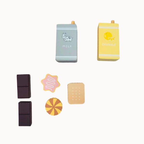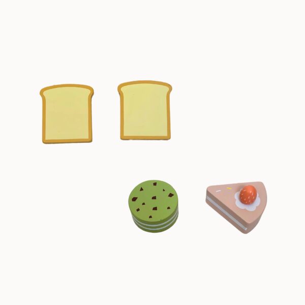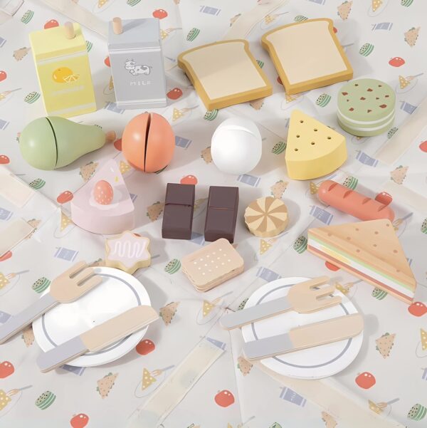 Incluye: 1 bolso/mat , 2 sets de vajilla, 2 tostadas, 2 chocolates, 2 galletitas, 1 macarron, 1 leche, 1 jugo, 1 torta, 1 sandwich, 1 salchicha, 1 huevo, 1 pera, 1 durazno. Todo de madera!!! Increíble y didáctico, para jugar e imaginar!!