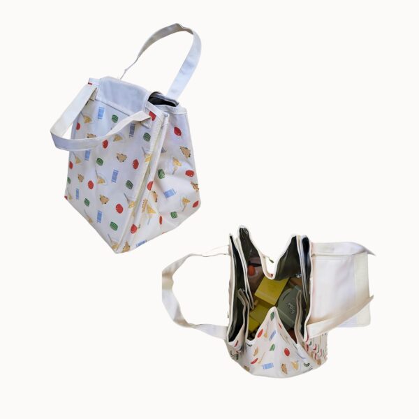 Juego de picnic que trae un bolso con manijas y velcro, que al abrirse funciona como una manta de picnic.
