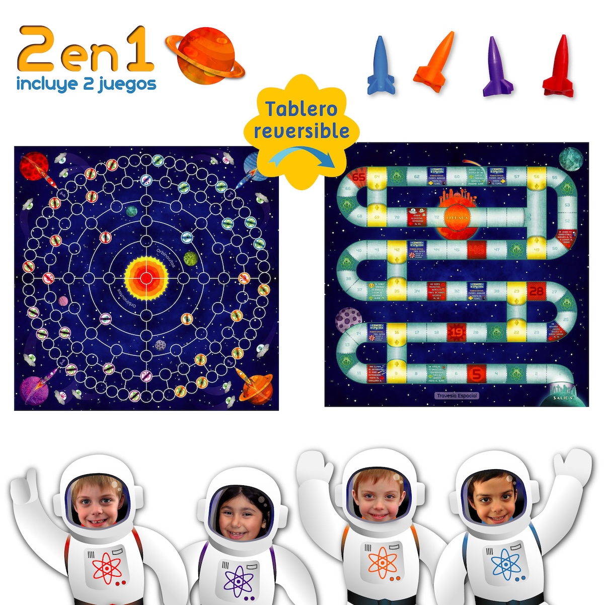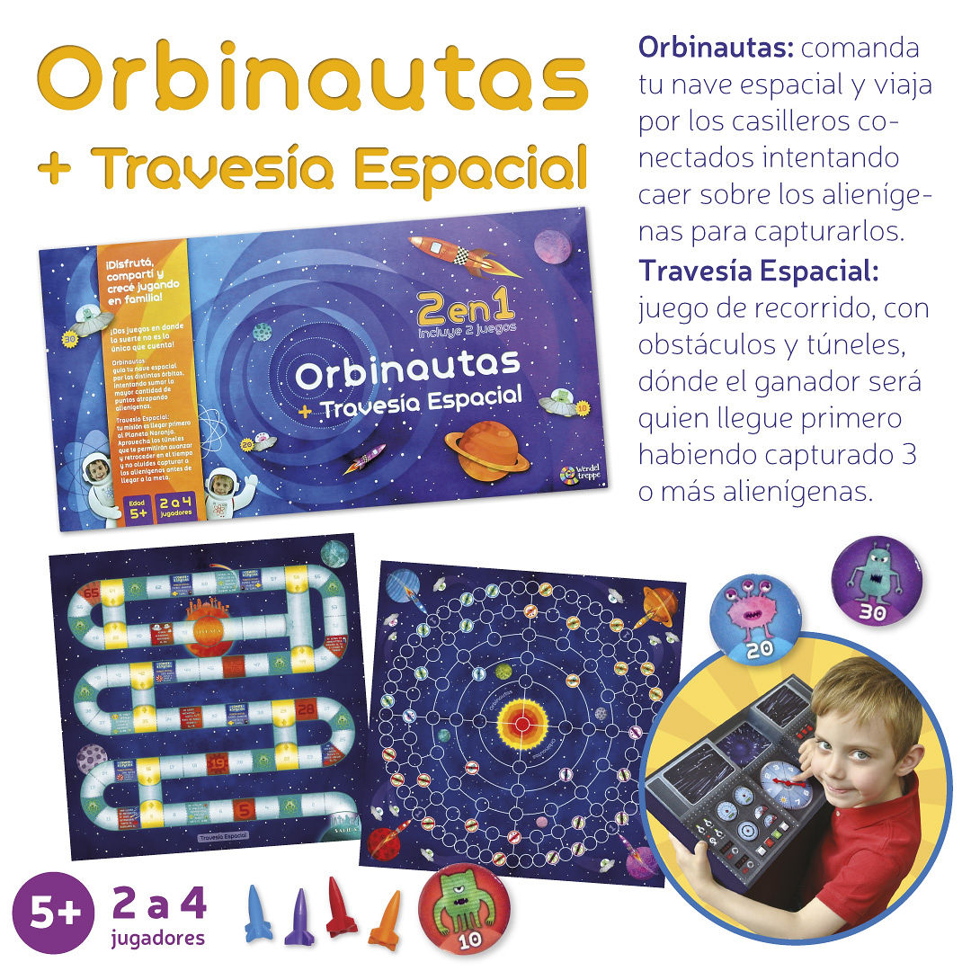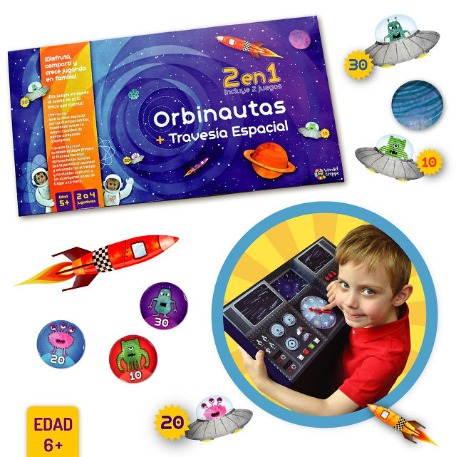 Una presentación que incluye dos juegos, elaborados con materiales de alta calidad, especialmente pensados para que los niños se entretengan a la vez que ponen en práctica sus habilidades sociales e intelectuales. Orbinautas y Travesía Espacial son juegos en donde la suerte debe combinarse con la estrategia para lograr alcanzar la meta.