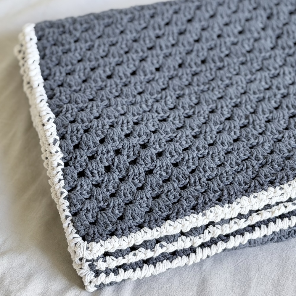 Manta tejida a mano en hilo de algodón gris oscuro, divina y única!!! Con rebordes blancos y excelentes terminaciones.