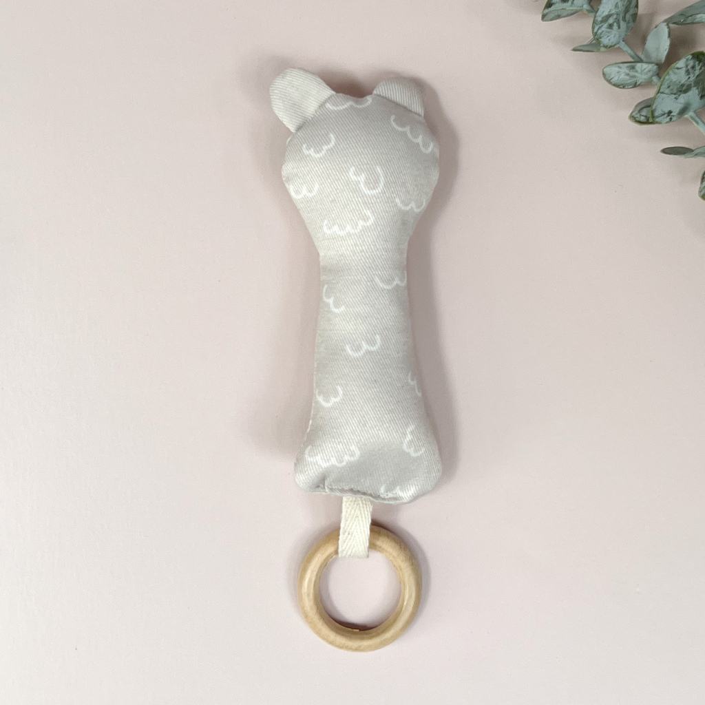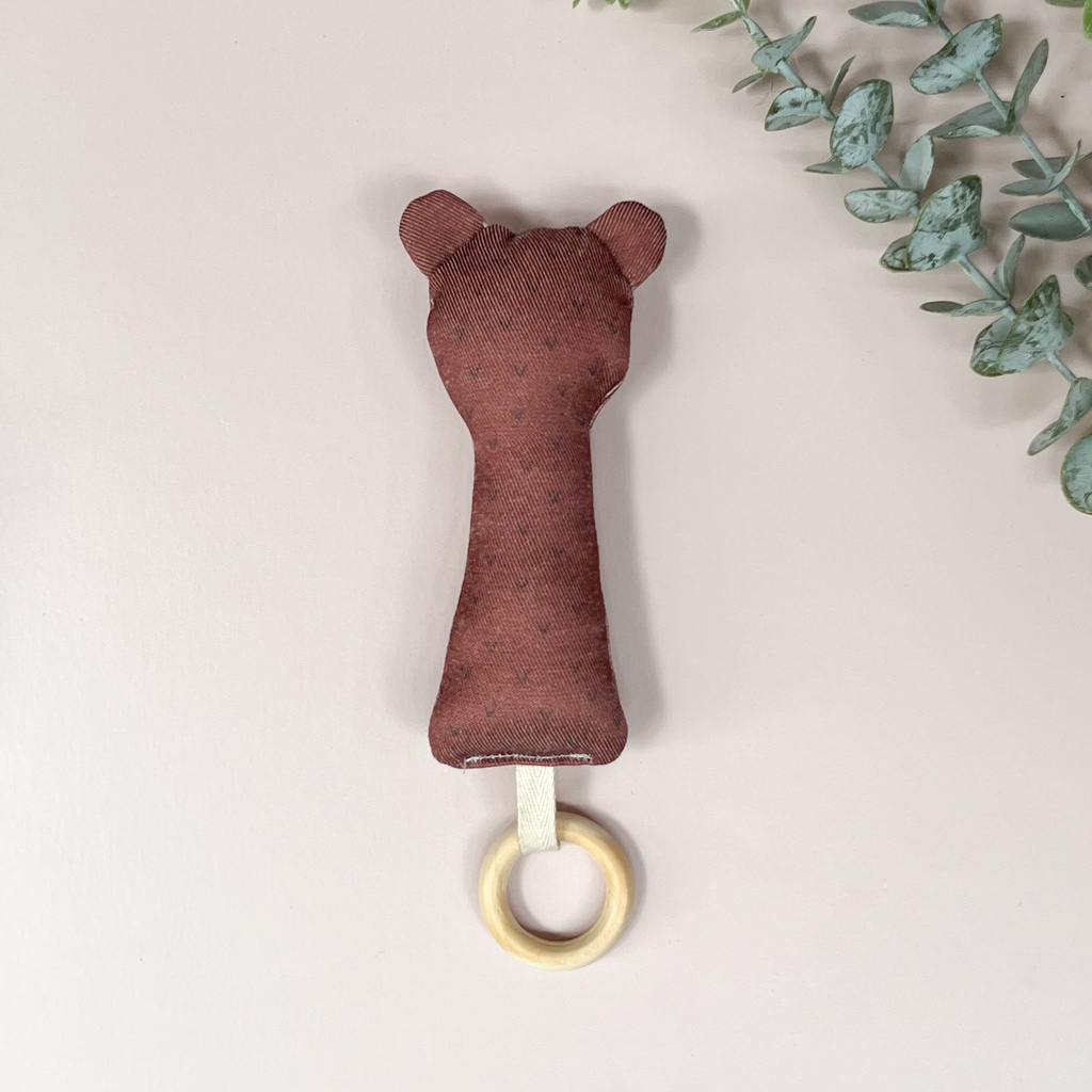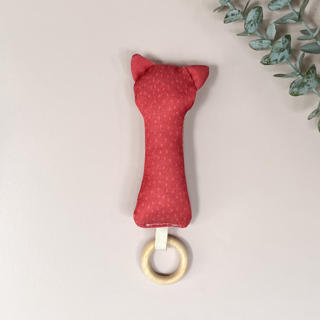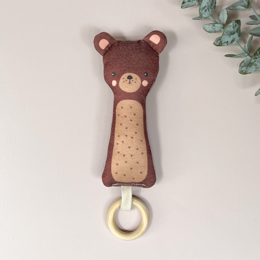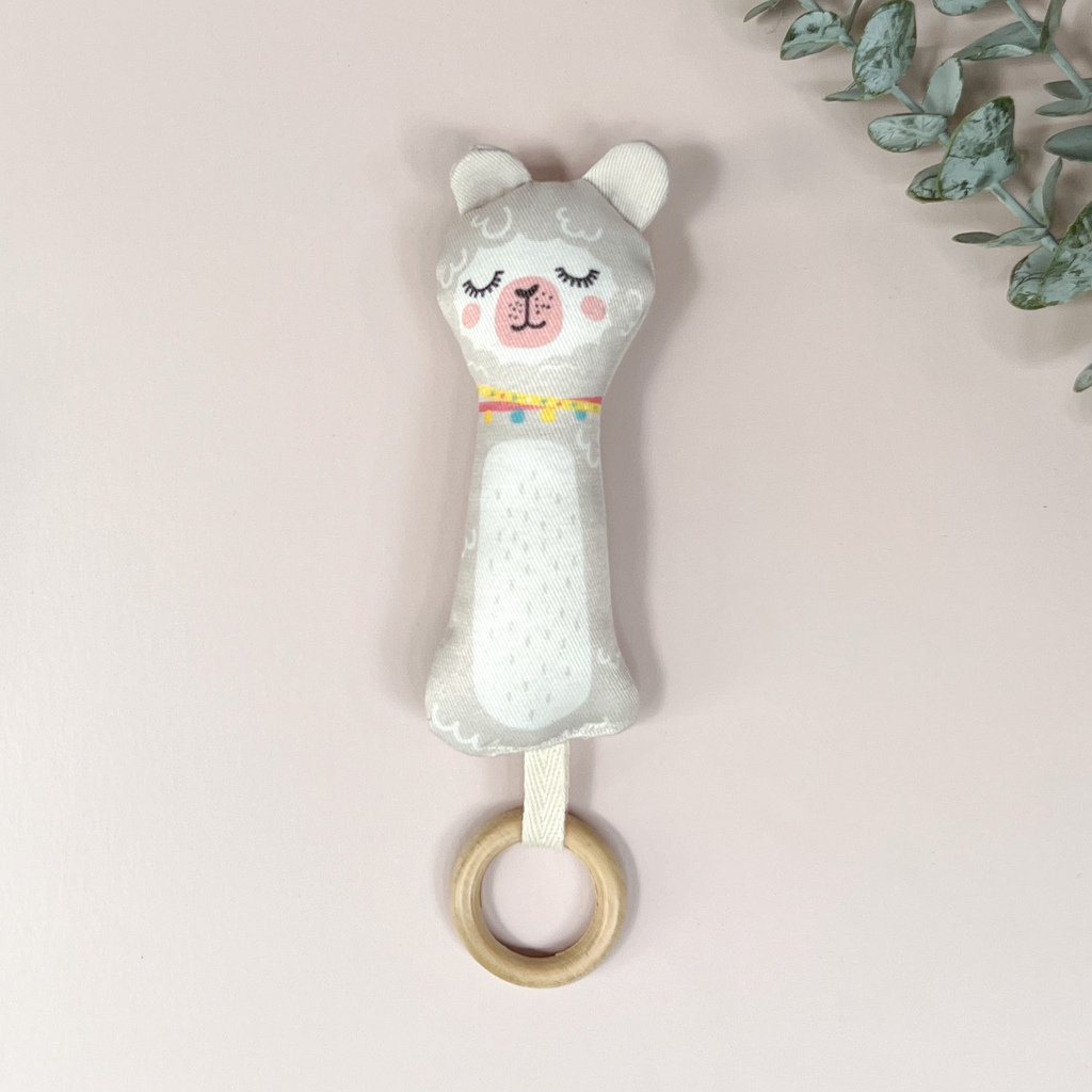 Sonajero bastón ideal para sostener primeros objetos. Es liviano y su tamaño de 20 cm aprox. permite que las manos del bebé accedan a sujetarlo. Contiene una arandela de madera para ofrecer otro medio de manipulación y ruidito sonajero al agitarlo en su interior.