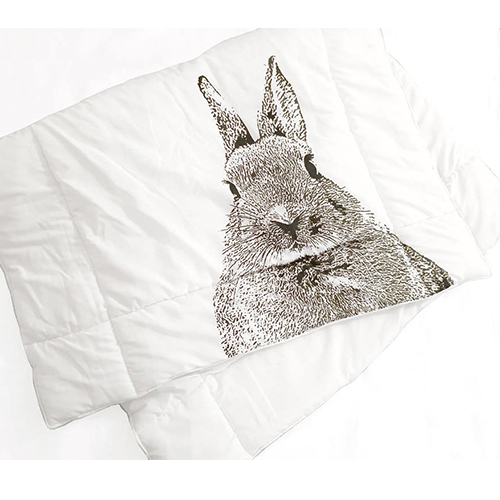 Acolchado realizado en tela panamá crudo, blanco o gris, estampado con serigrafía en color negro, gris o blanco.