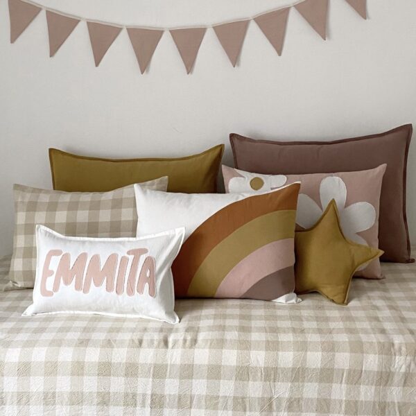 Acolchado realizado en tussor 100% algodón, con cuadros arena de un lado y reverso color natural.