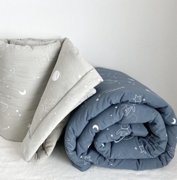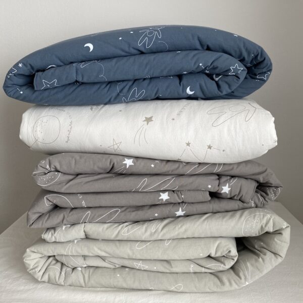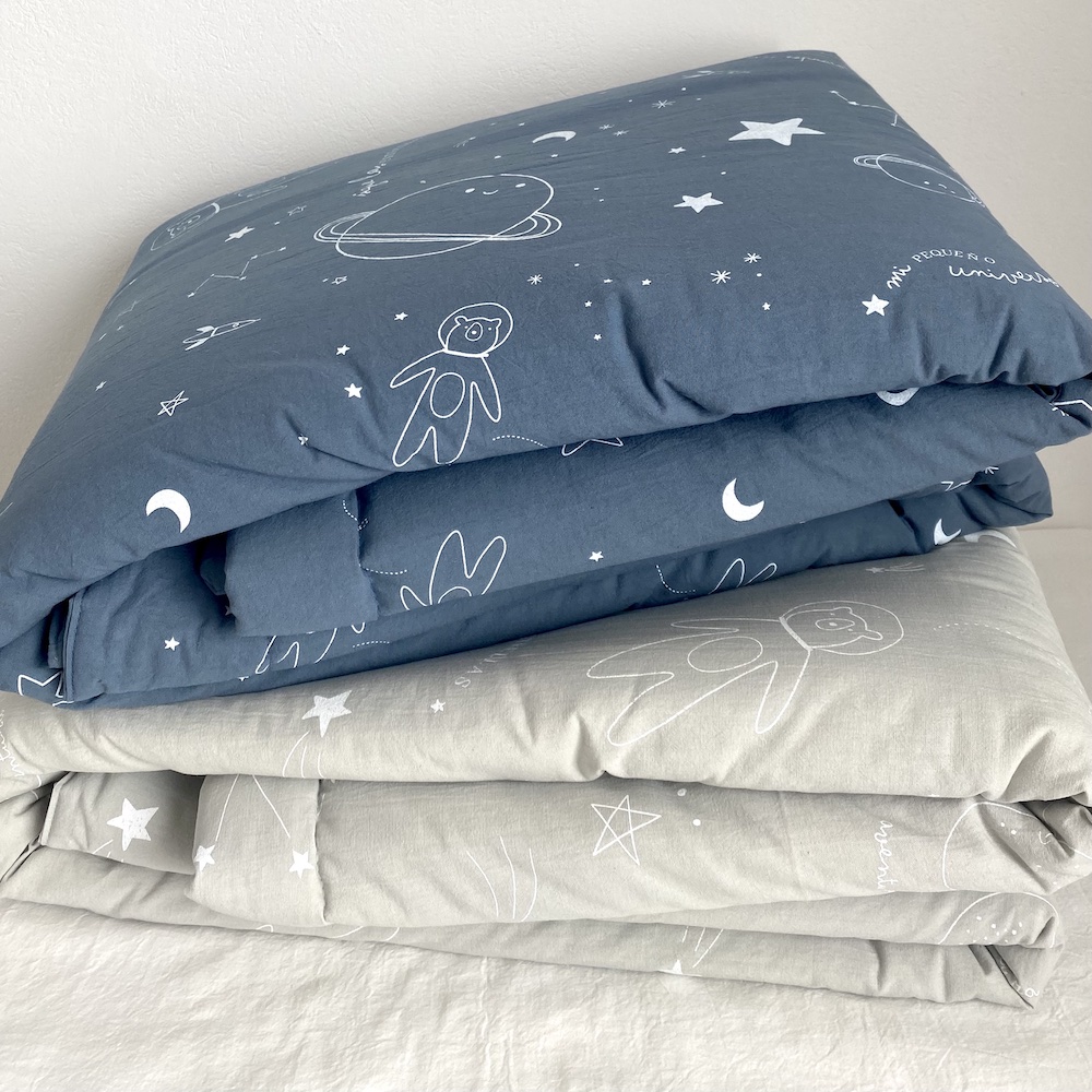 Acolchados realizados en tussor 100% algodón, con estampa galaxia sobre genero de diferentes colores. Relleno con guata.