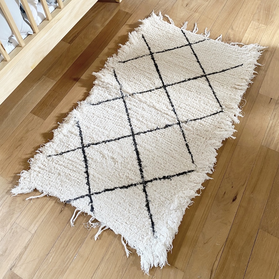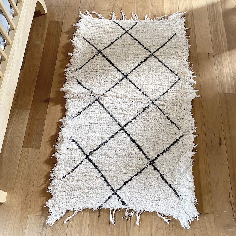 Alfombra realizada en hilo de algodón crudo, con lineas geométricas negras. Apta lavarropas!!