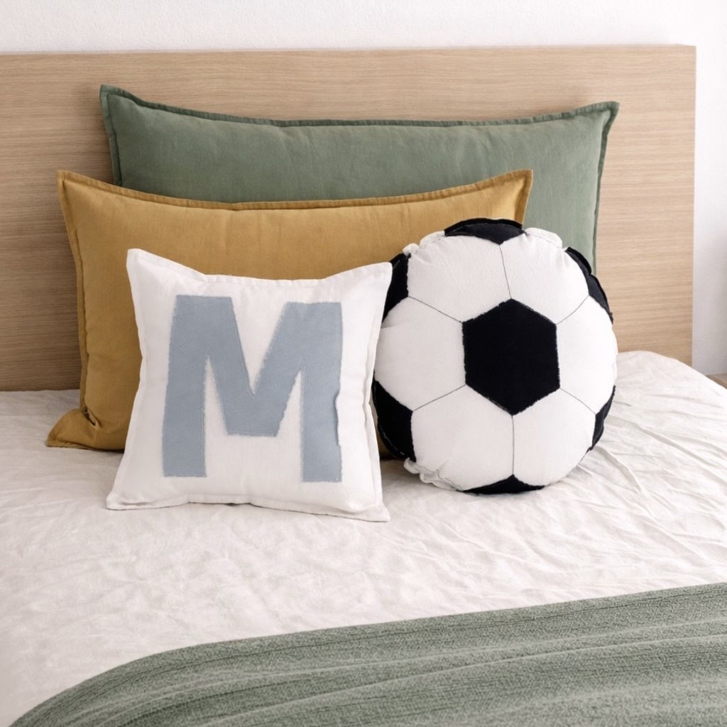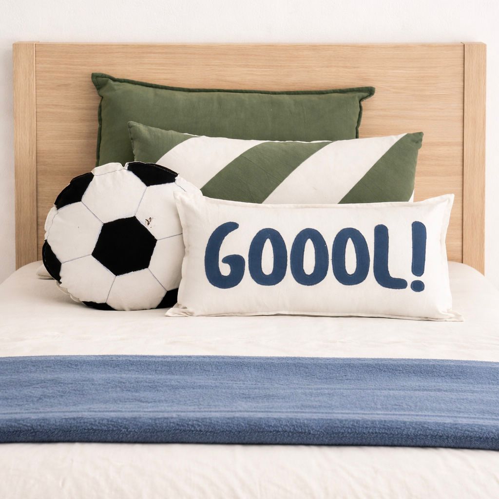 Almohadón íntegramente confeccionado en tussor 100% algodón, con diseño de pelota de futbol.
