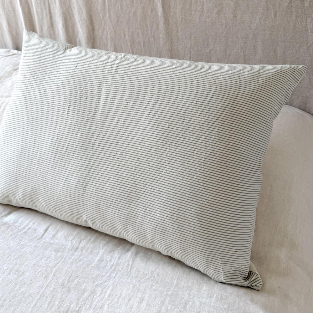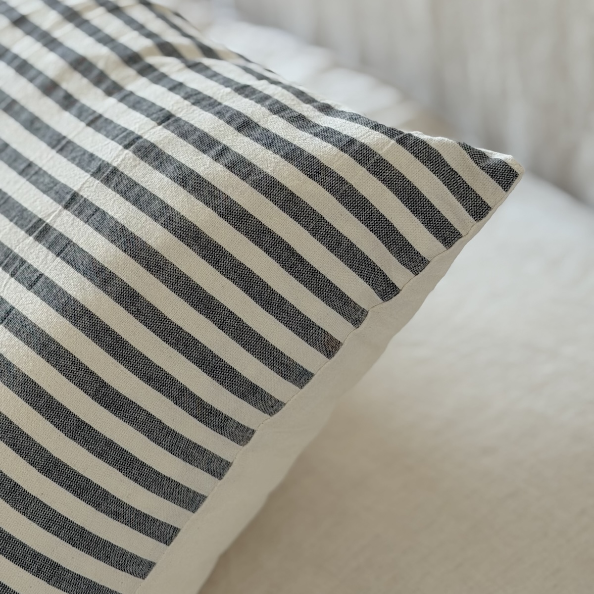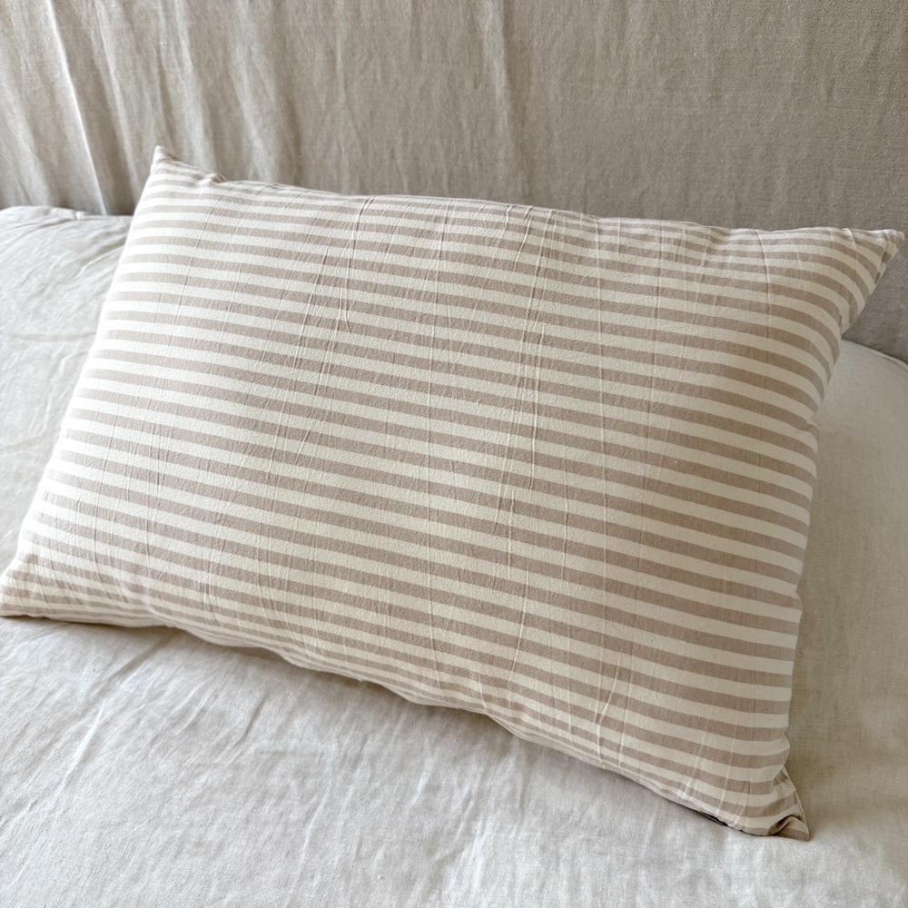 Almohadón realizado tussor rayado de un lado, crudo del otro. Genero 100% algodón.