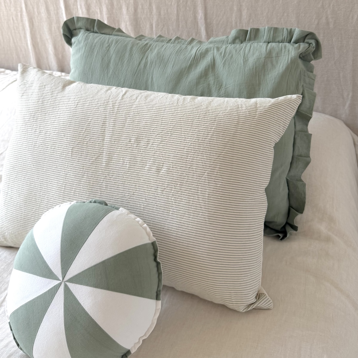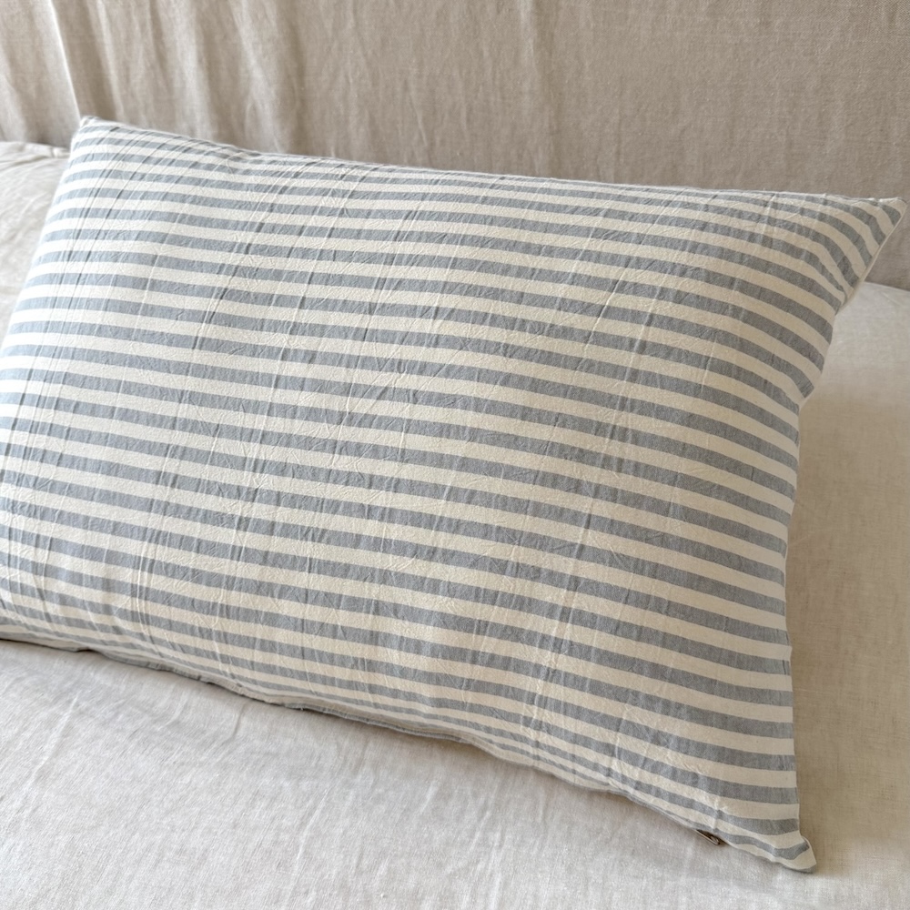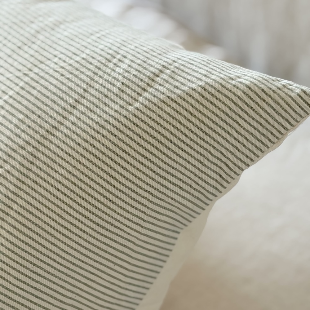 Almohadón realizado tussor rayado de un lado, crudo del otro. Genero 100% algodón.