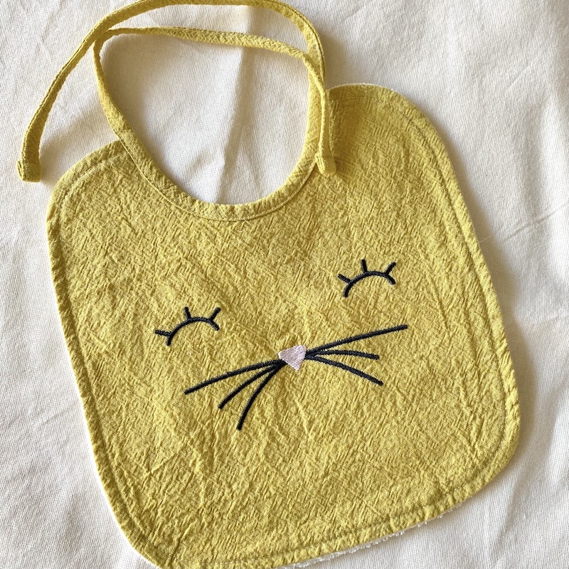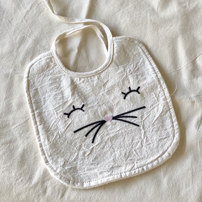 Babero realizado en lienzo 100% algodón, bordado con carita de gatito, ideal para la hora de comer.
