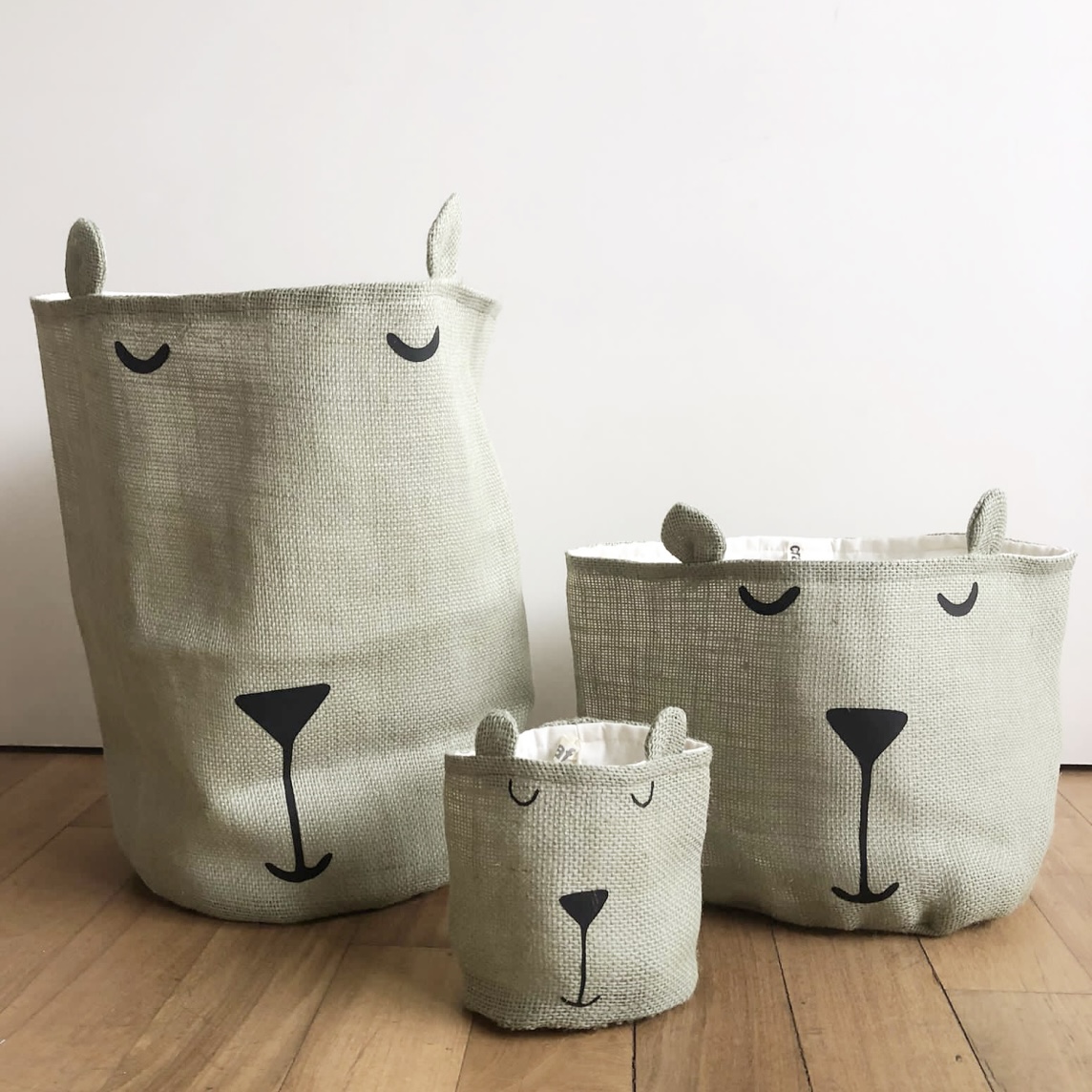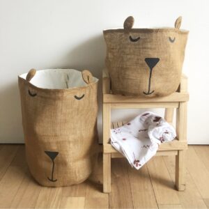Basket arpillera color habano o verde con diseño de osito.