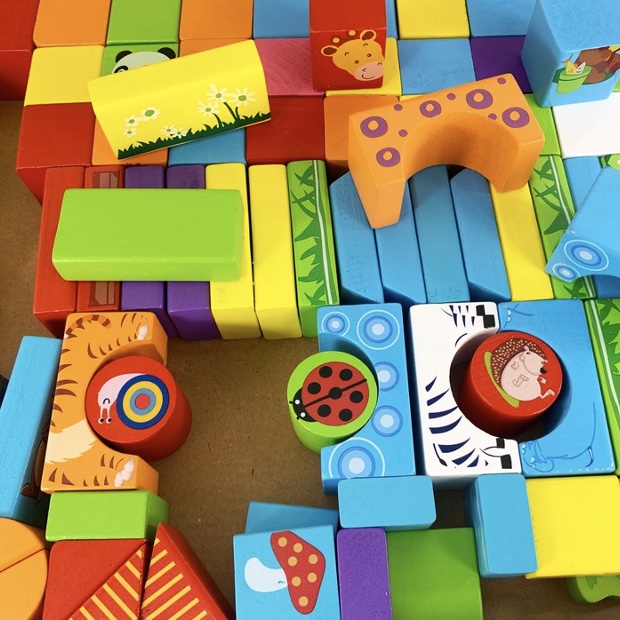 Bloques de madera didácticos con formas temática, ideales para apilar y crear. Incluye 100 piezas con distintas formas y colores (plantas, animales, números y tanto mas)