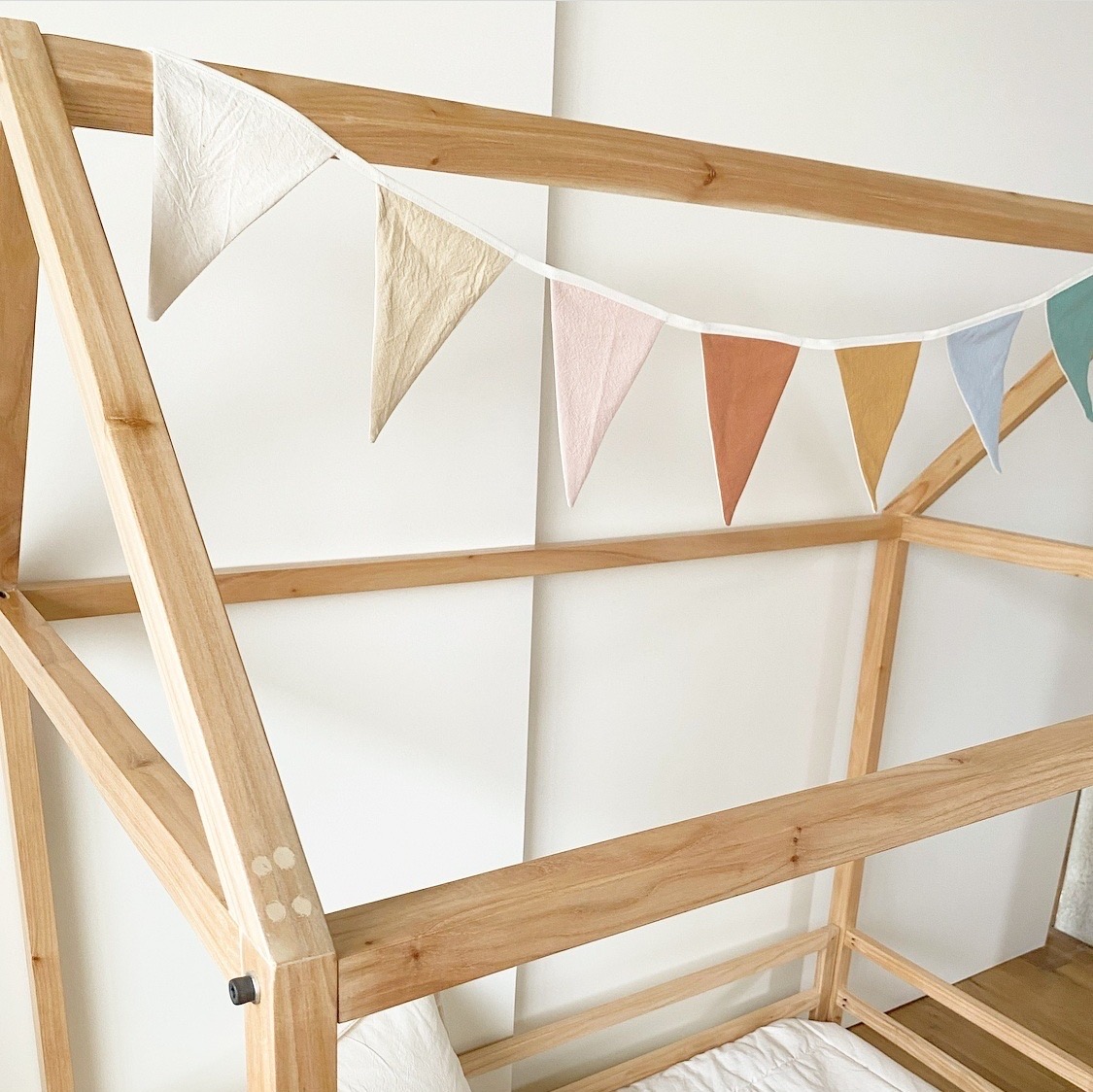 Cama casita al piso, realizada en madera paraiso maciza y barandas.
