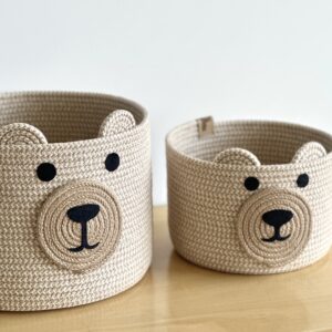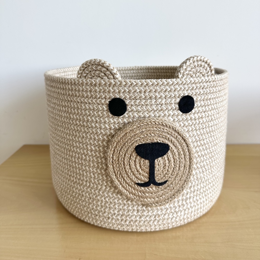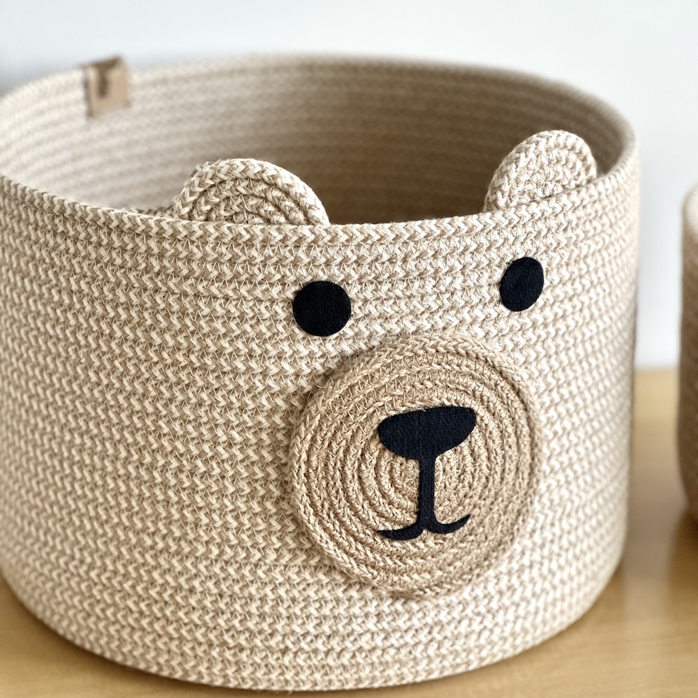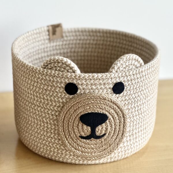 Cesto con carita de oso, confeccionado completamente a mano con yute jaspeado con algodón, por lo que sus medidas pueden variar sutilmente.