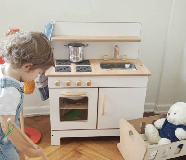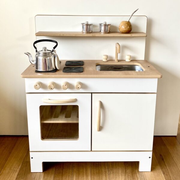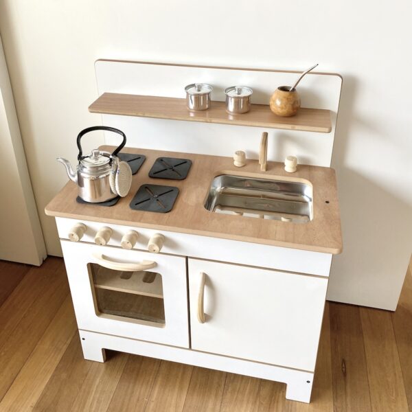 Cocinita realizada en madera enchapada natural y melamina blanca. Con bordes, puntas y filos redondeados para proteger a los minis de la casa!