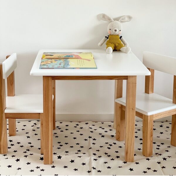 Mesa realizada en madera maciza paraíso, con las tapa en blanco laqueado. Para jugar, dibujar y divertirse!!
