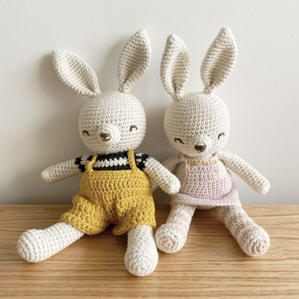 La coneja lleva jumper rosa y el conejo jardinero mostaza. Su repita se puede sacar y poner.