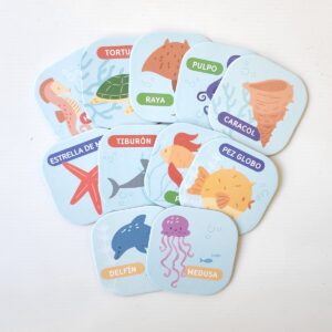Cada ficha mide 7 x 7 cm y esta laminada en ambas caras, con puntas redondeadas.