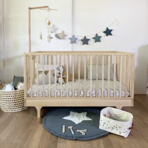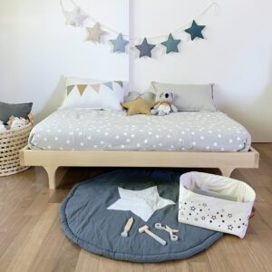 Mesa de 90 x 40 x 50cm realizada en madera paraíso enchapado + 2 jugueteros de 40x40x40cm laqueados, con ruedas ocultas.