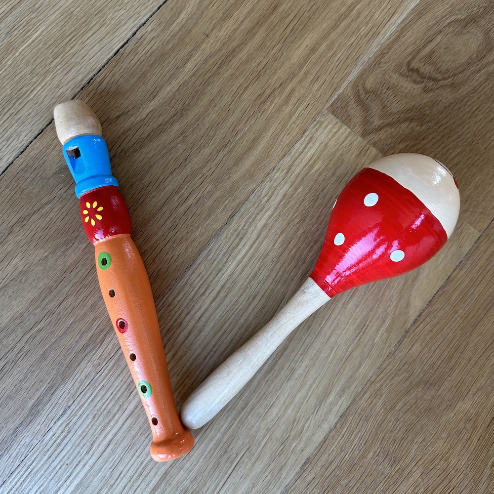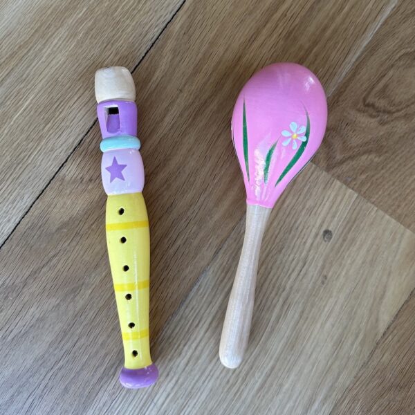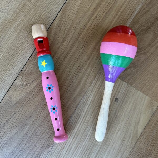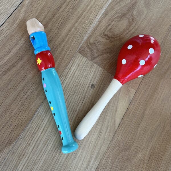 Incluye 2 instrumentos de madera: flauta y maraca.