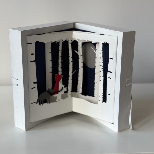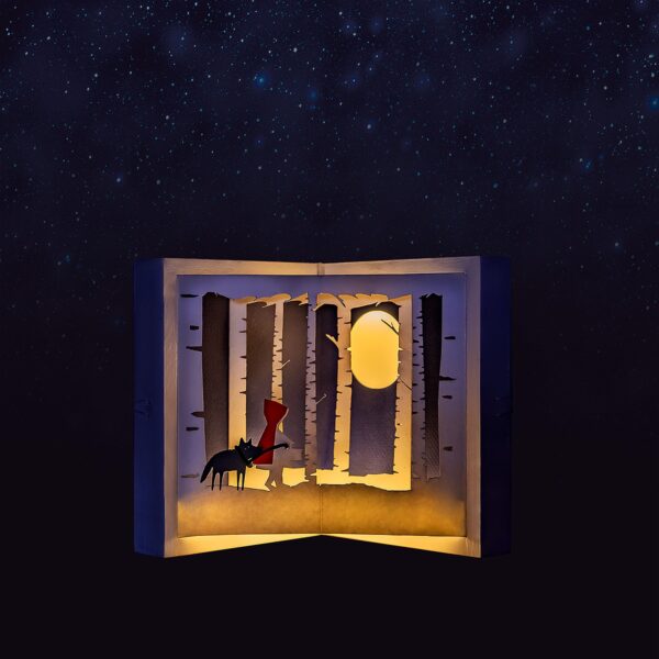 Libro con luz de exclusivo diseño de caja de madera que se abre como un libro de pop-up, revelando cautivadoras imágenes que dan sensación 3D y brillan con una luz tenue y relajante gracias a sus luces LED ocultas en su interior. Funciona como luz de noche para que tu pequeño duerma tranquilo.