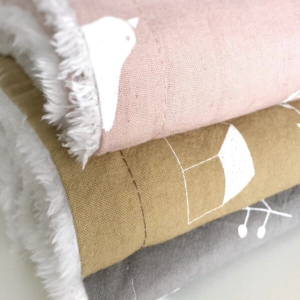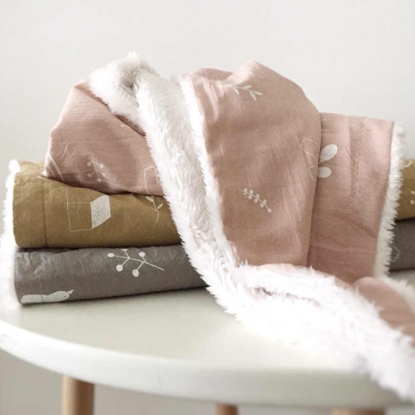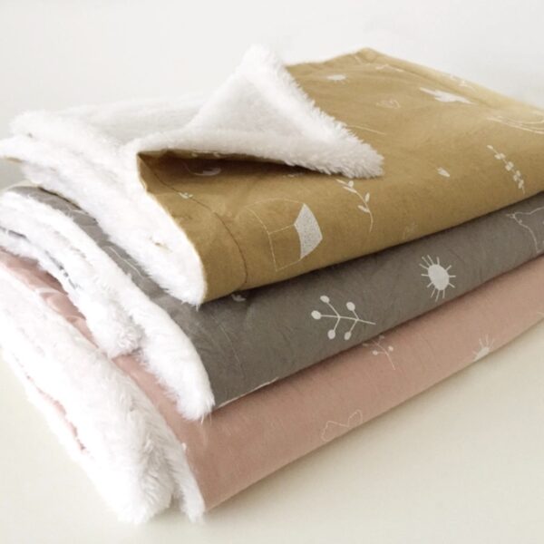 Manta naturaleza estampada en tela 100% algodón, con reverso de corderito color natural.