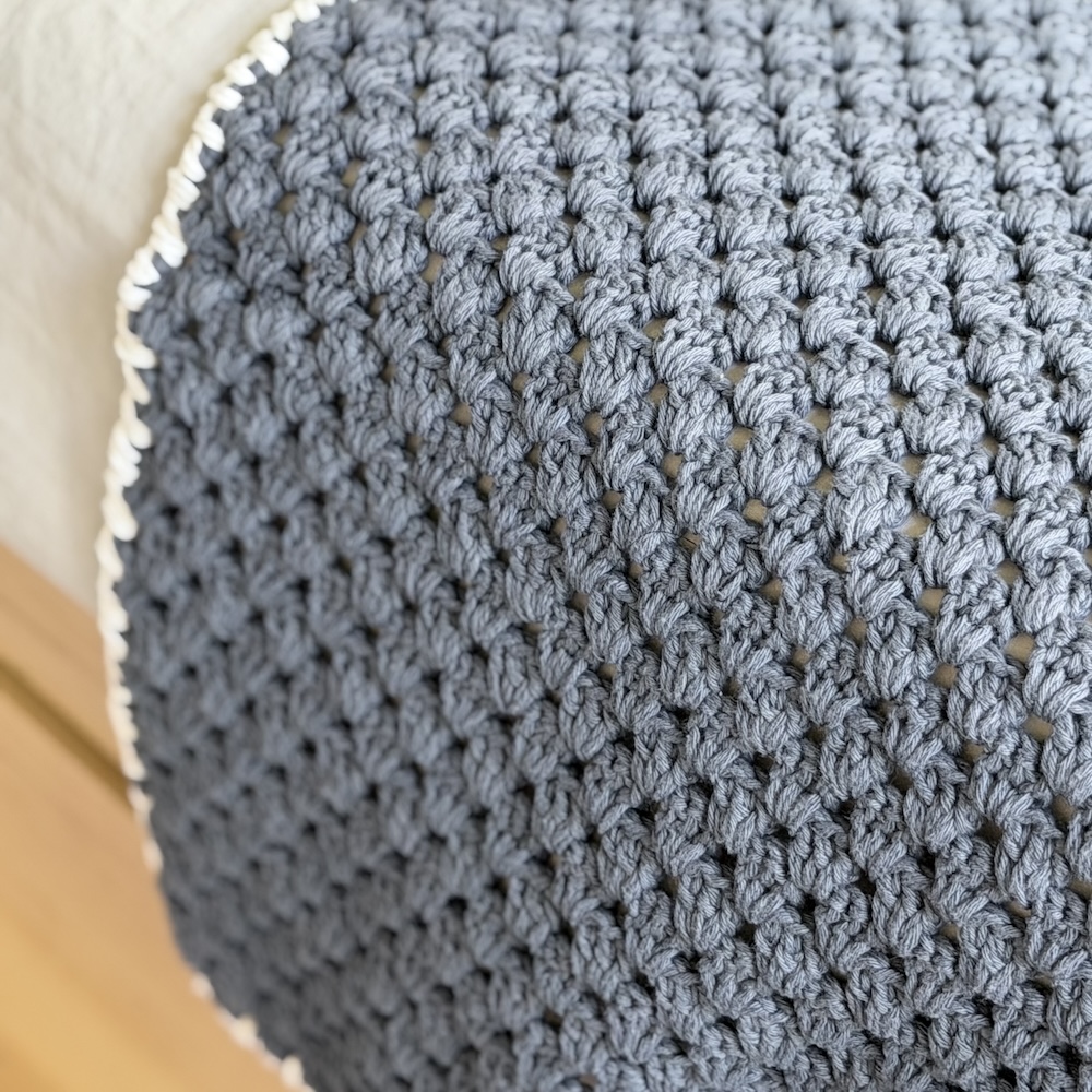 Manta tejida a mano en hilo de algodón gris oscuro, divina y única!!! Con rebordes blancos y excelentes terminaciones.