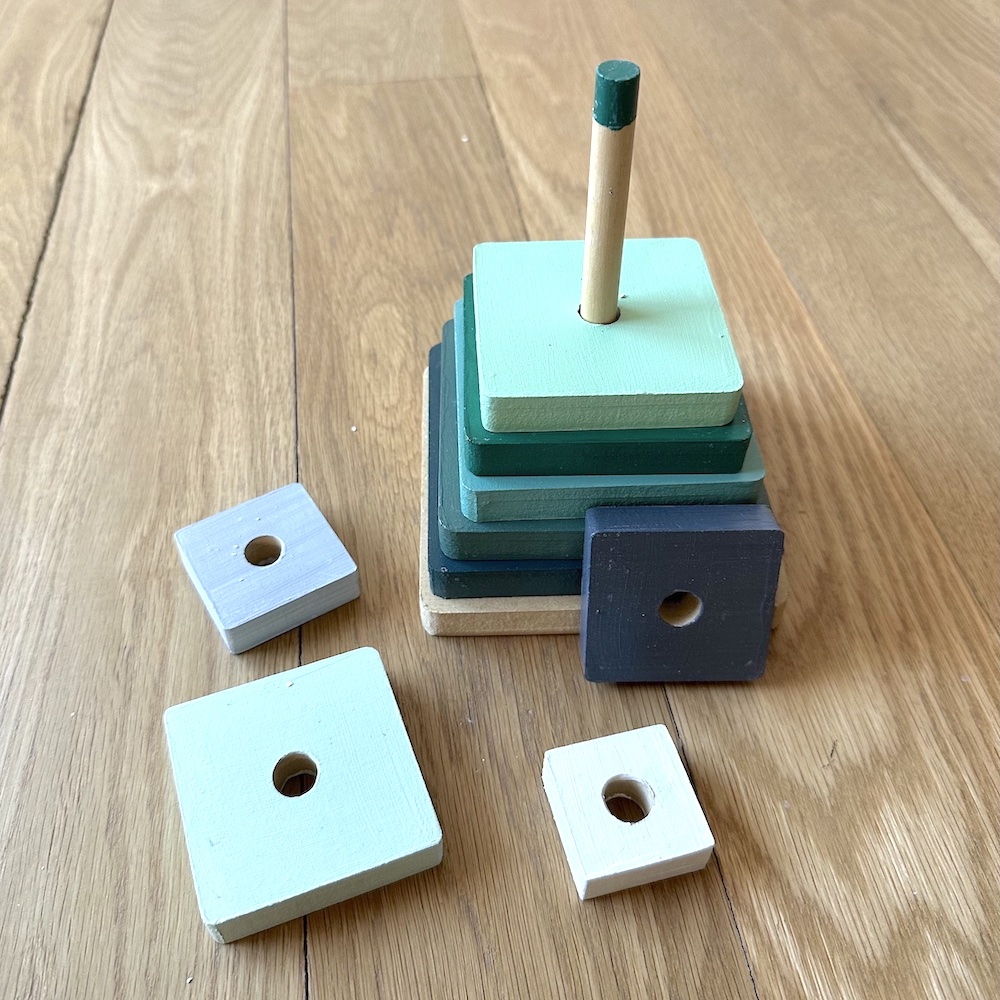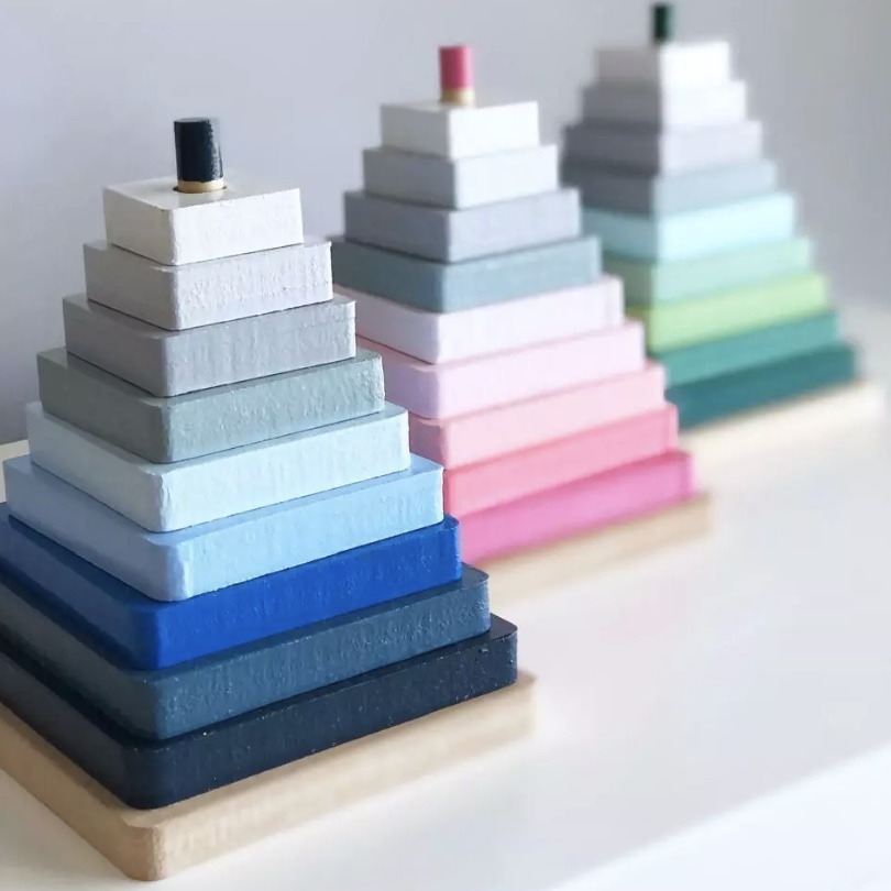Torre encastre realizada en mdf con pinturas no tóxicas, con forma de pirámide.