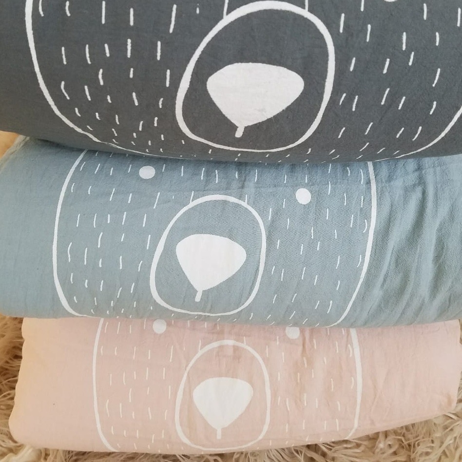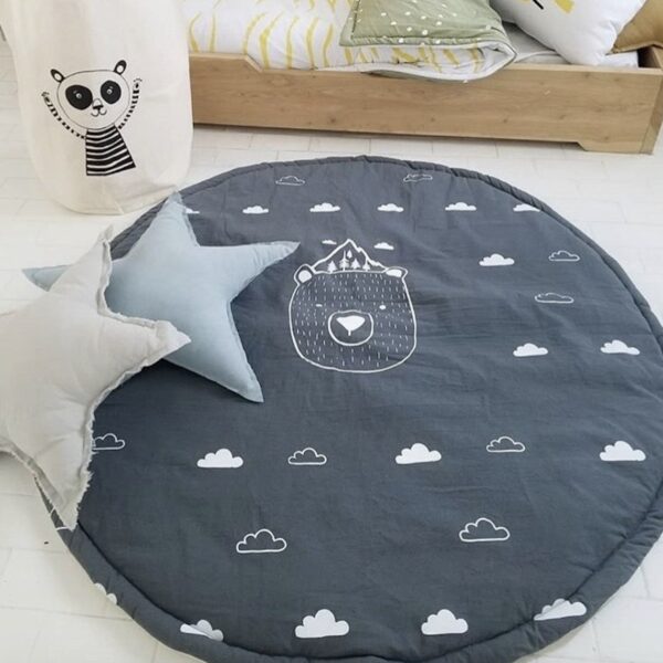 Alfombra de juego circular, realizada en tussor, con estampa en blanco.