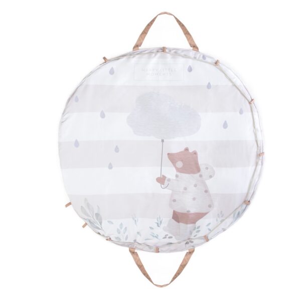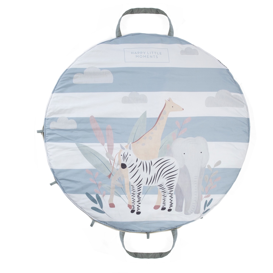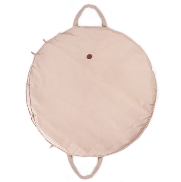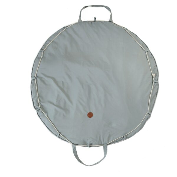 Playmat realizada en micro fibra, rellena con guata. La rodea una correa, que al tirar los extremos, se cierra transformandose en bolso para transportar los jueguetes fácilmente.