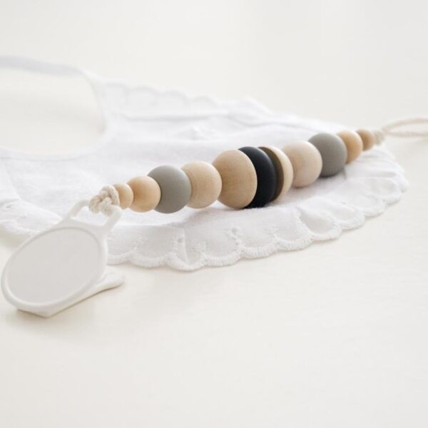 Portachupetes de madera y silicona de color. Trae 2 siliconas celestes o grises, y una silicona negra en el centro.