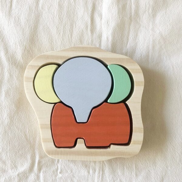 Puzzle de madera con 4 piezas pintadas + un tablero para formar un adorable elefante.