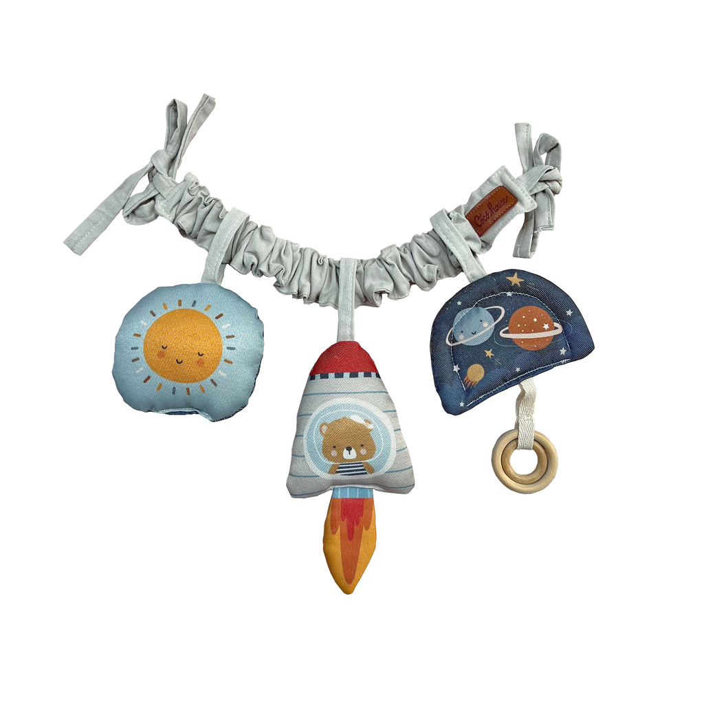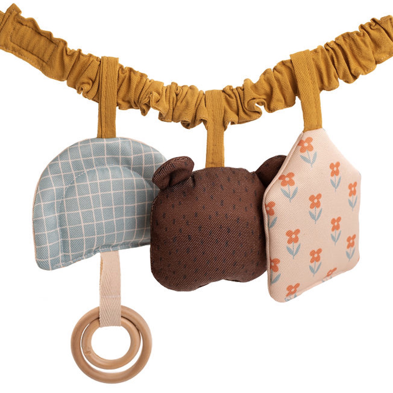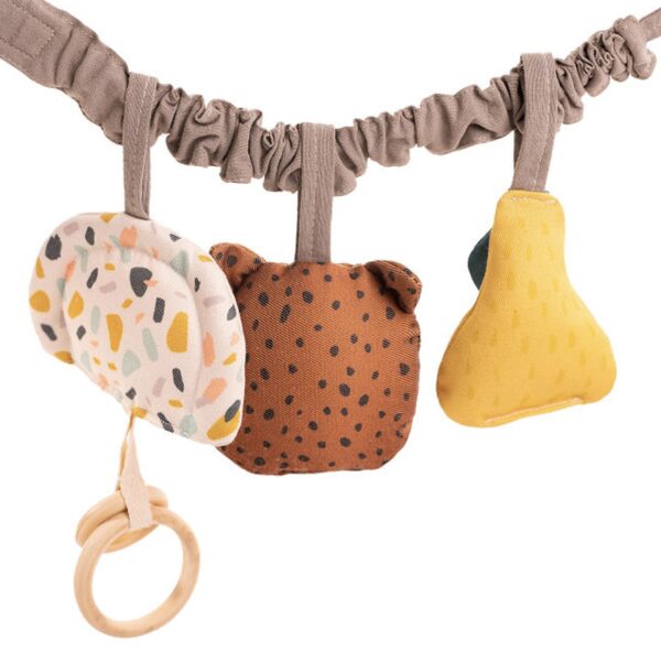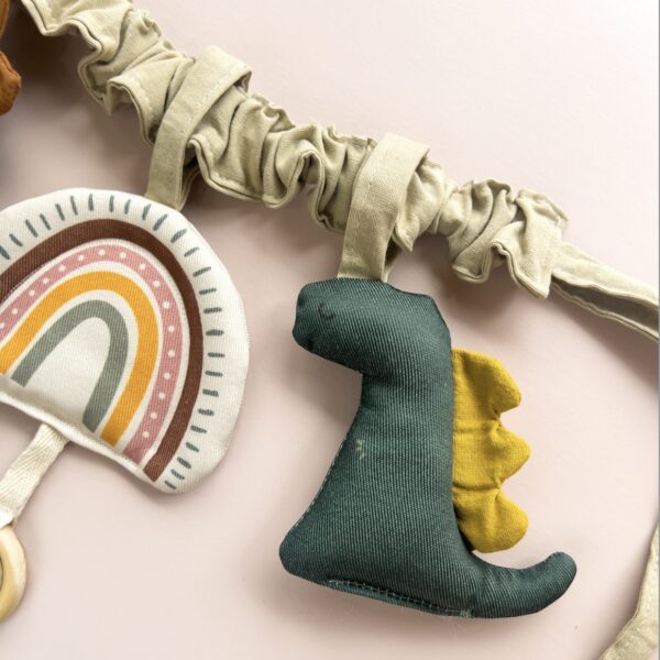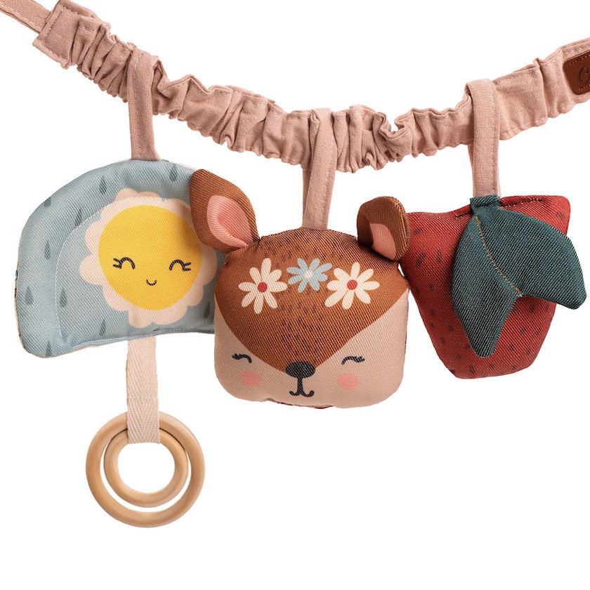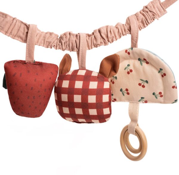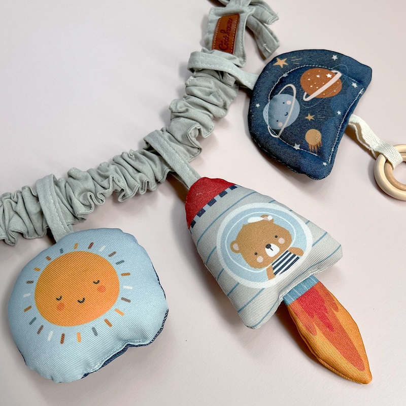 Sonajeros colgantes para el cochecito o cuna. Contiene sonido sonajero (cascabel/cajita sonajero y papel) para que tu bebé explore. Vienen presentados en una tira de elástico forrada adaptable a cualquier medida de barral de cochecito y también podés atarlo al lateral de la cuna. Es ideal para bebés que ya se sientan solitos y solitas.