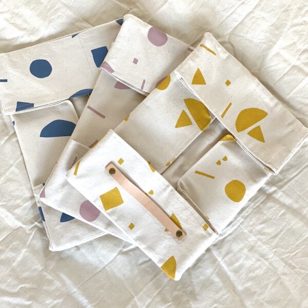 Estampados en serigrafía con tintas al agua no tóxicas. Manijas de cuero natural.