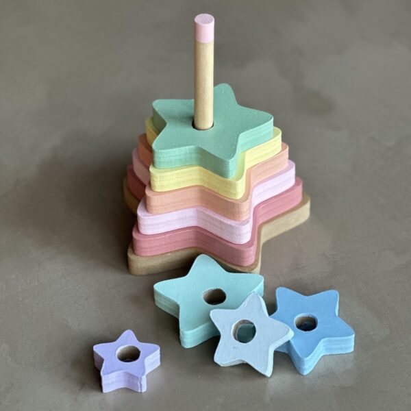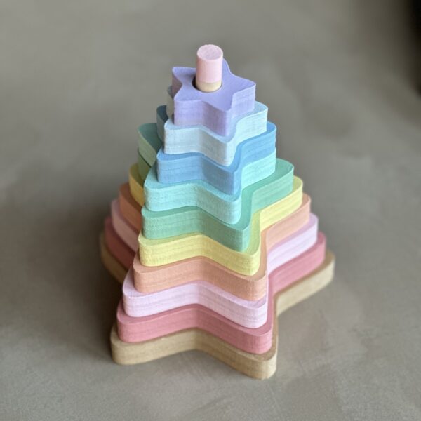 Torre encastre realizada en mdf con pinturas no tóxicas, con forma de estrella.